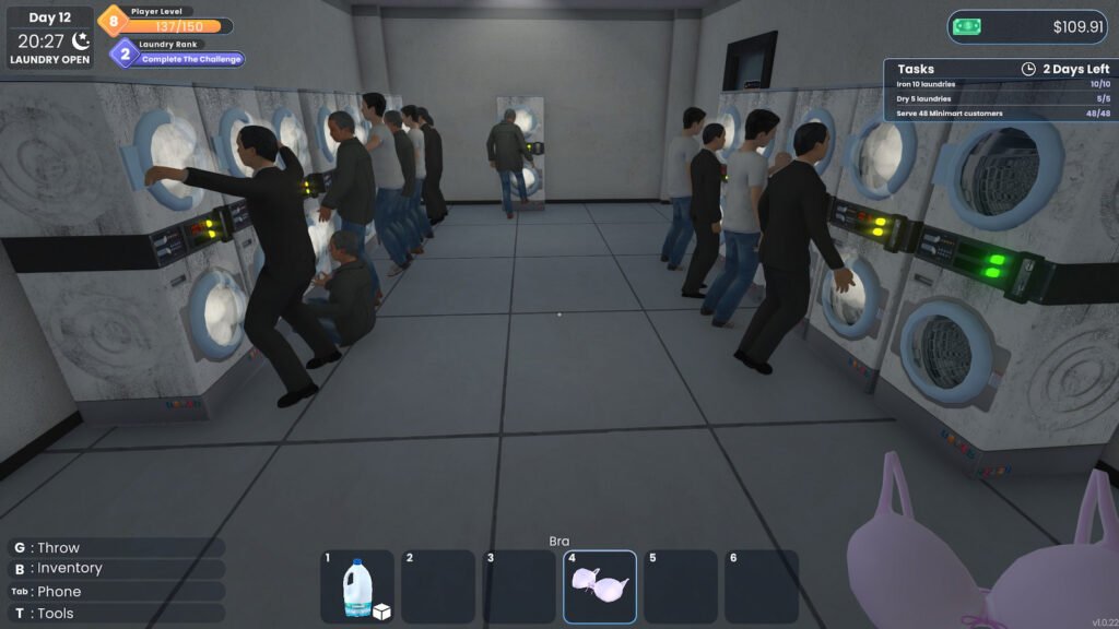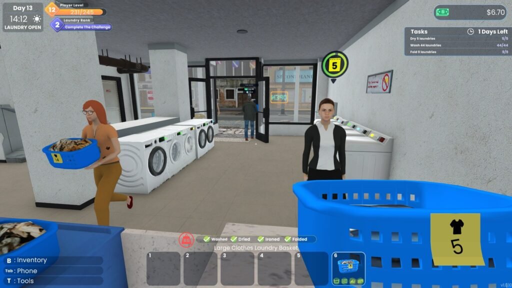 El punto de partida es básico: comienzas con una lavandería pequeña, pocas máquinas y recursos limitados. A partir de ahí, el juego te pone a cargo de prácticamente todo: atender clientes, lavar y secar ropa, mantener el orden del local y reinvertir las ganancias para mejorar el negocio.