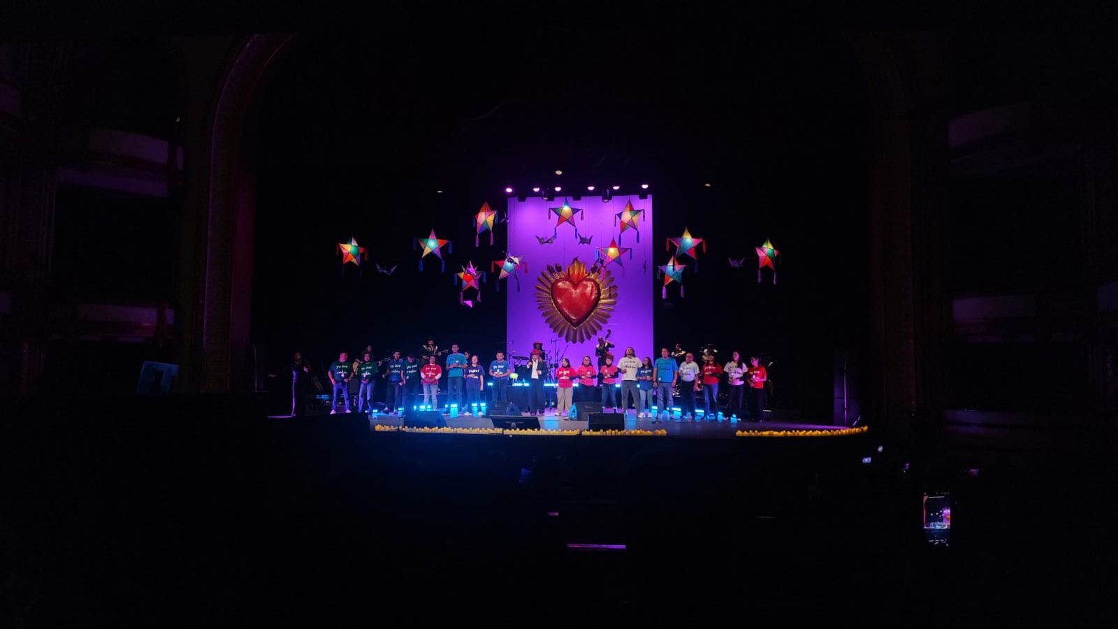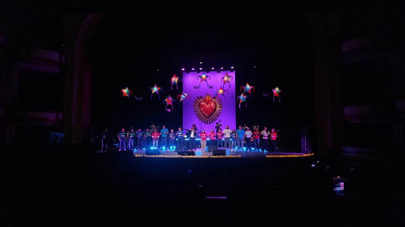 Luego de que las luces se apagaron, se abrió el telón revelando una colorida e impactante escenografía compuesta por linternas de estrellas y aves acompañando a un gran corazón envuelto en un resplandor de cartonería que colgaban del techo, la escenografía fue realizada -por compañeras privadas de su libertad física de Santa Martha- informó Vivir.