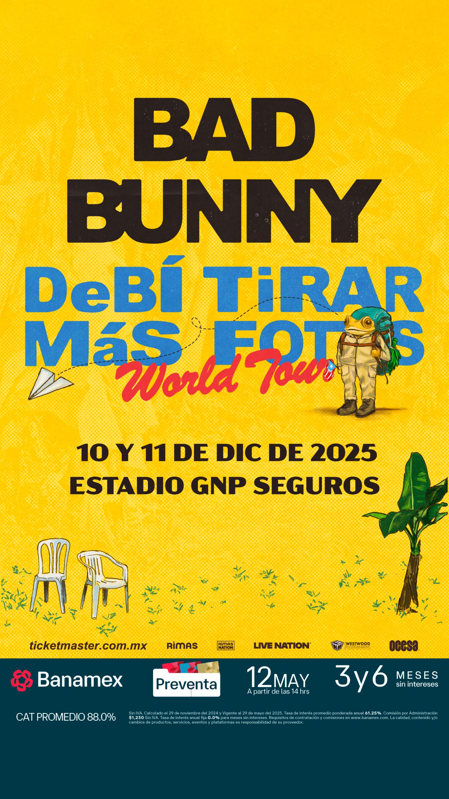Este anuncio de la gira llega en un momento clave en la carrera de Bad Bunny, tras el masivo éxito de su sexto álbum de estudio. DeBÍ TiRAR MáS FOToS, estuvo tres semanas consecutivas en el puesto #1 del Billboard 200 y continúa fuerte con 13 semanas en el Top 10. Además, ha mantenido el puesto #1 en la lista Top Latin Albums de Billboard durante 16 semanas consecutivas. Bad Bunny también alcanzó el puesto #1 en la lista Artist 100 de Billboard e hizo historia al convertirse en el primer artista latino en lograr 100 entradas en el Billboard Hot 100, consolidando aún más su impacto global. Su dominio continuó cuando DeBÍ TiRAR MáS FOToS se convirtió en el primer álbum en español en colocar todas sus canciones en el Billboard Hot 100 durante tres semanas consecutivas.