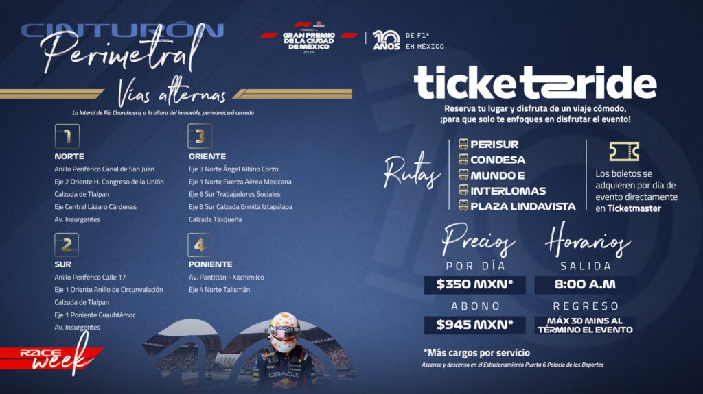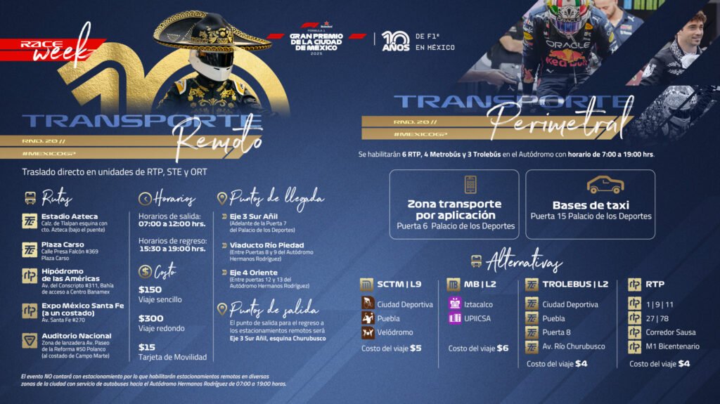 Además, para agilizar la movilidad en la zona, se habilitará transporte perimetral gratuito (RTP, Metrobús y Trolebús) en el circuito del Autódromo Hermanos Rodríguez con el fin de acercar a los asistentes a la puerta que les corresponda, con un horario de 7:00 a 20:00 hrs.