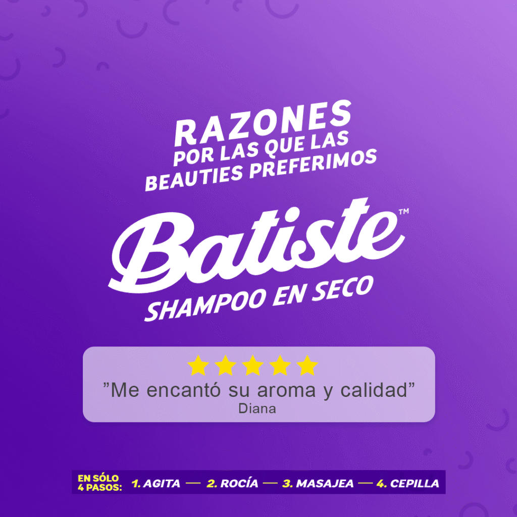 Batiste es la marca líder mundial de shampoo en seco, dedicada a ofrecer soluciones rápidas y efectivas para el cuidado del pelo. Desde su fundación, Batiste ha revolucionado la rutina de belleza diaria, proporcionando productos innovadores que permiten a las personas lucir y sentirse mejor en cualquier momento y lugar. Con una amplia gama de fragancias y fórmula natural a base de almidón de arroz, Batiste se adapta a todo tipo de pelo y estilo, brindando frescura instantánea y volumen sin necesidad de agua. Nuestra misión es empoderar a nuestras consumidoras para que vivan con confianza y estilo, todos los días. Más información está disponible en el sitio web de Batiste: https://batiste.com.mx/