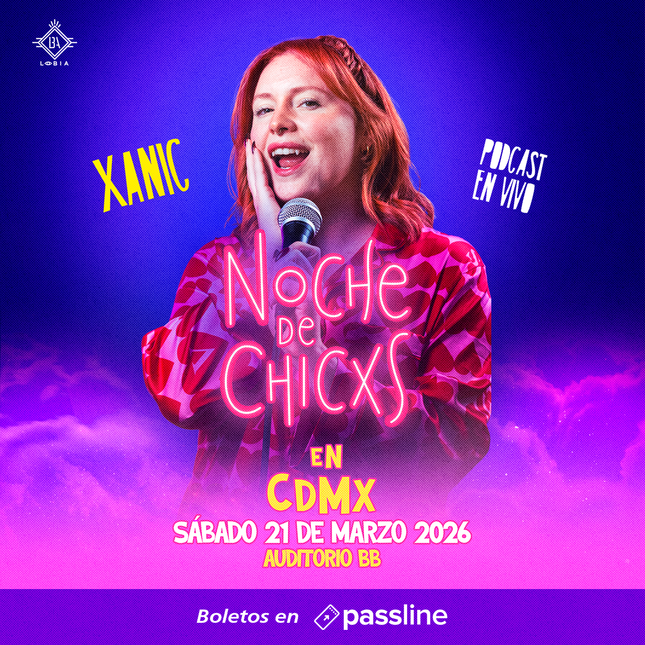 «Noche De Chicxs» cobra vida sobre el escenario del Auditorio BB el próximo 21 de marzo. Esta será una experiencia única en la que podrás sentirte parte de tu podcast favorito de una manera más cercana y personal.